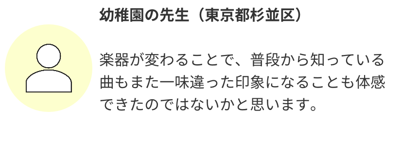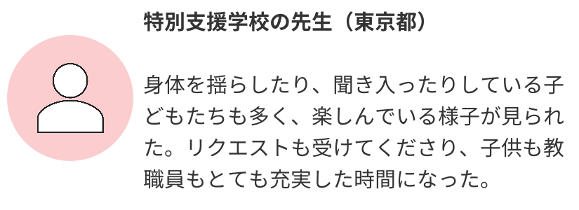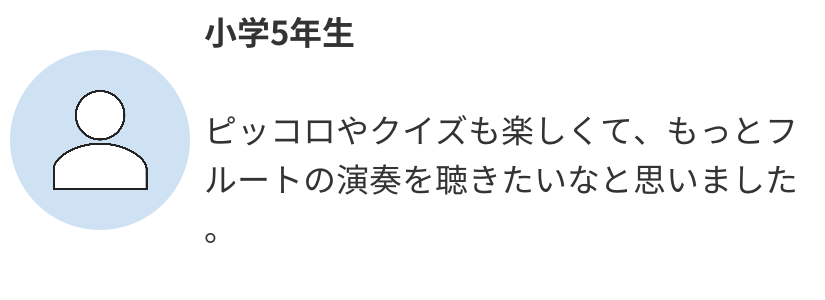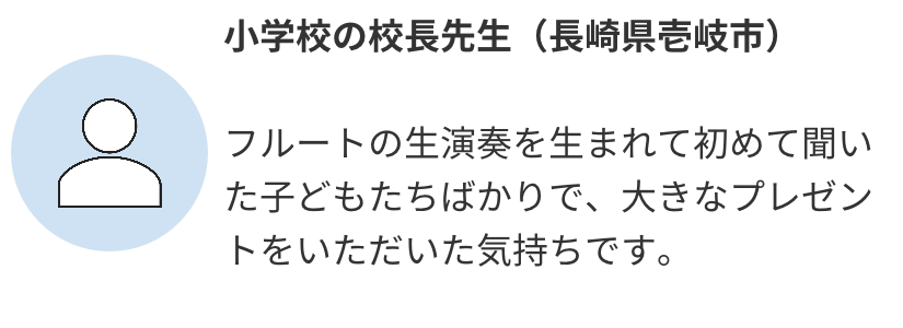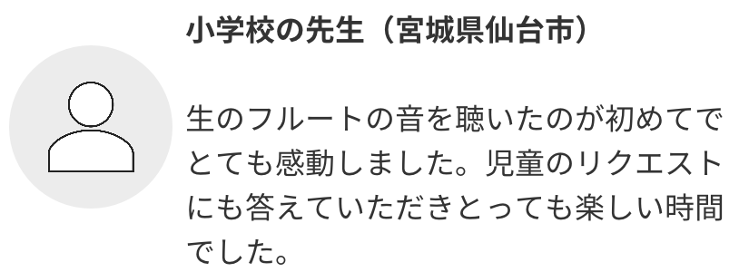 これまでに、東京都を中心に幼稚園、小学校、特別支援学校を訪問し、1,000人以上のこどもたちへ生演奏や音楽をテーマにしたクイズなどをお届けしてきました。フルートを初めて聴く人やクラシック音楽にあまり馴染みがない人にも音楽の楽しさを伝えたい思いから、全国の小学校でコンサートをすることを目指しています。